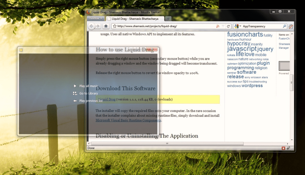Liquid Drag is a lightweight utility that enhances your computer’s usability by making windows translucent while dragging. This feature allows for precise window positioning by revealing the content underneath, making multitasking more efficient and seamless. Designed to work on any hardware, Liquid Drag is compatible with any version of Windows.
